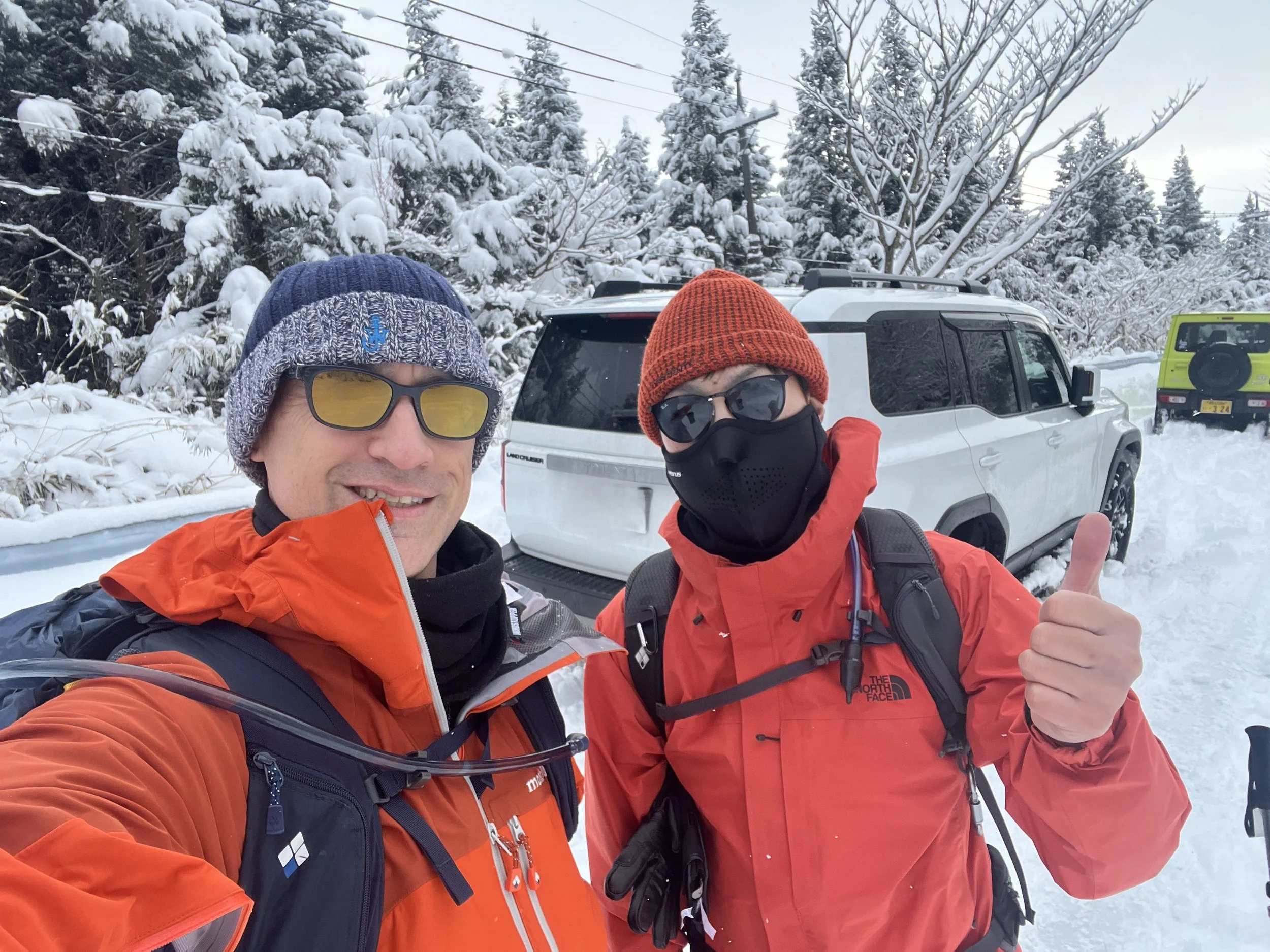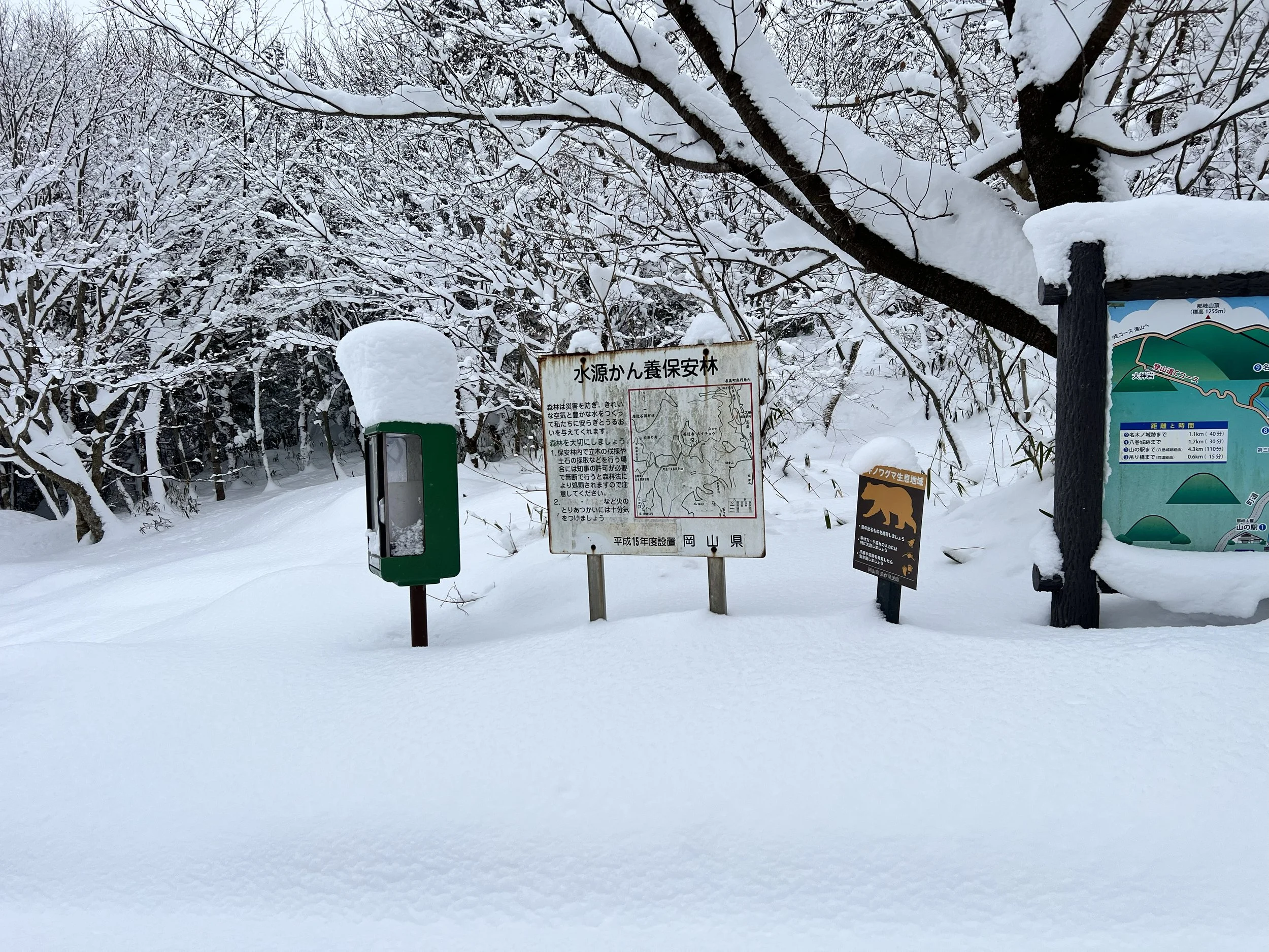 We got stuck behind several accidents and traffic jams, so we didn’t arrive at the mountain until around 10am. Also, we couldn’t get to the hiking trail parking lot because the snow on the road was so deep. Even M’s big truck with massive snow tires and 4-wheel drive couldn’t get through. So, we had to park about 800 meters down the hill and park on the side of the road.